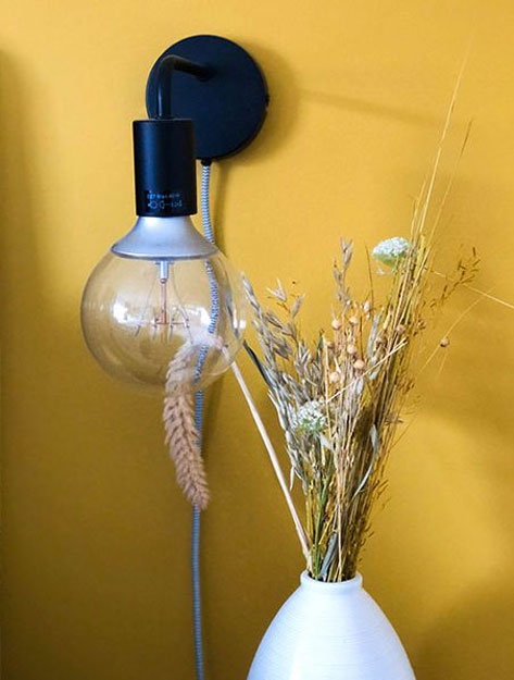 ‘’In onze woonkamer hebben we gekozen voor neutrale tinten zoals zwart, wit en grijs. Daarom vonden we het wel zo spannend om in de slaapkamer uit te pakken met oker geel!”