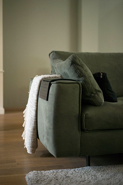 Voorheen hadden we twee losse zwarte banken. Graag wilden we een hoekbank om de kamer meer te vullen. Verder was onze wens om deze keer géén zwarte bank te kiezen. Eerst wilden we voor een grijze bank gaan, maar hebben uiteindelijk voor groen gekozen. Dit is minder standaard, valt meer op en geeft gelijk kleur in je interieur. We zijn heel blij dat we voor de Juno hoekbank van Trendhopper Huissen hebben gekozen. Uitgevoerd in de actie stof, 3,5 zits met hoekzit element.